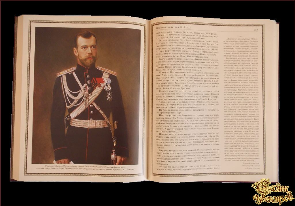 Российская империя Для подготовки книги использованы тексты выдающегося русского историка А. М. Зайончковского "Мировая война 1914 - 1918 годов" в двух томах, а также описание военных событий Первой мировой войны известного историка А. А. Керсновского. В книге используются мемуары генералов А. А. … Читать дальшеБрусилова и А. И. Деникина, что позволяет читателю представить ход событий на фронтах. Обстановку в стране и при царском дворе освещают подборки текстов из дневников императора Николая II, а также из мемуаров начальника канцелярии министра двора генерала А. А. Мосолова и посла Франции в России М. Палеолога. Книга проиллюстрирована плакатами времен Первой мировой войны, лубочными картинками для солдат, картинами известных художников и черно-белыми документальными иллюстрациями и фотографиями из периодических изданий того времени Страниц: 448 (Мелованная) Масса: 2230 г Размеры: 315x245x36 мм. Кожаный переплет. Ручная работа. Тиснение золотой фольгой
