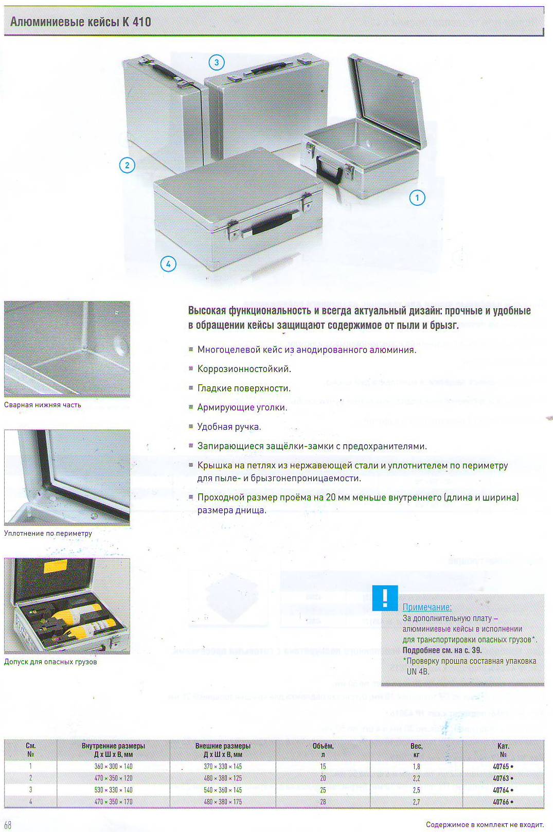 Кейс (кофр) алюминиевый (Германия). От 15 литров до 28 литров. Кейсы и кофры Zarges, такие же надежные как алюминиевые ящики, отлично подойдут для бережной транспортировки документов, различного рода приборов и оборудования. Кейсы выполнены из алюминия, что гарантирует им высокие прочностные характеристики и н… Читать дальшеебольшой вес, что особенно актуально при эксплуатации. Кофры и кейсы устойчивы к негативным воздействиям температуры, погодным осадкам, а также другим жидкостям и веществам, которые могут навредить транспортируемому грузу. Алюминиевые кейсы представлены в различных размерах, что позволяет подобрать кейс под конкретные нужды отдельного покупателя. Технические особенности алюминиевых кейсов Анодированная поверхность из алюминиевого сплава. Широкие стальные шарнирные петли на заклепках кейса. Противоударные планки из полимерного материала по всему периметру. Полиуретановый уплотнитель, обеспечивающий защиту кейса от пыли и влаги. Удобная ручка для переноски и 2 замка с предохранителями от самопроизвольного открывания кейса. Кофры дополнительно оснащаются кодовыми замками, тканевой обивкой внутри, отделениями и фиксаторами крышки. Кейс алюминиевый Zarges - стильный защитный аксессуар для любого делового человека, который ценит стиль, надежность и долговечность! Как дополнительное оснащение для алюминиевых кейсов: цифровой замок, атташе-вкладыш, фиксатор крышки кейса. Наше качество – Ваша безопасность Полный каталог продукции Царгес на: http://zarges-all.ru/order Россия, 620042, Екатеринбург, ул. Ломоносова, д. 55Б, офис 14, тел./факс: (343) 382-69-10, 381-59-97 www.kaiman.ru, www.zarges-all.ru, www.zarges.com/ru - сайт производителя. E-mail: ural@kaiman.ru