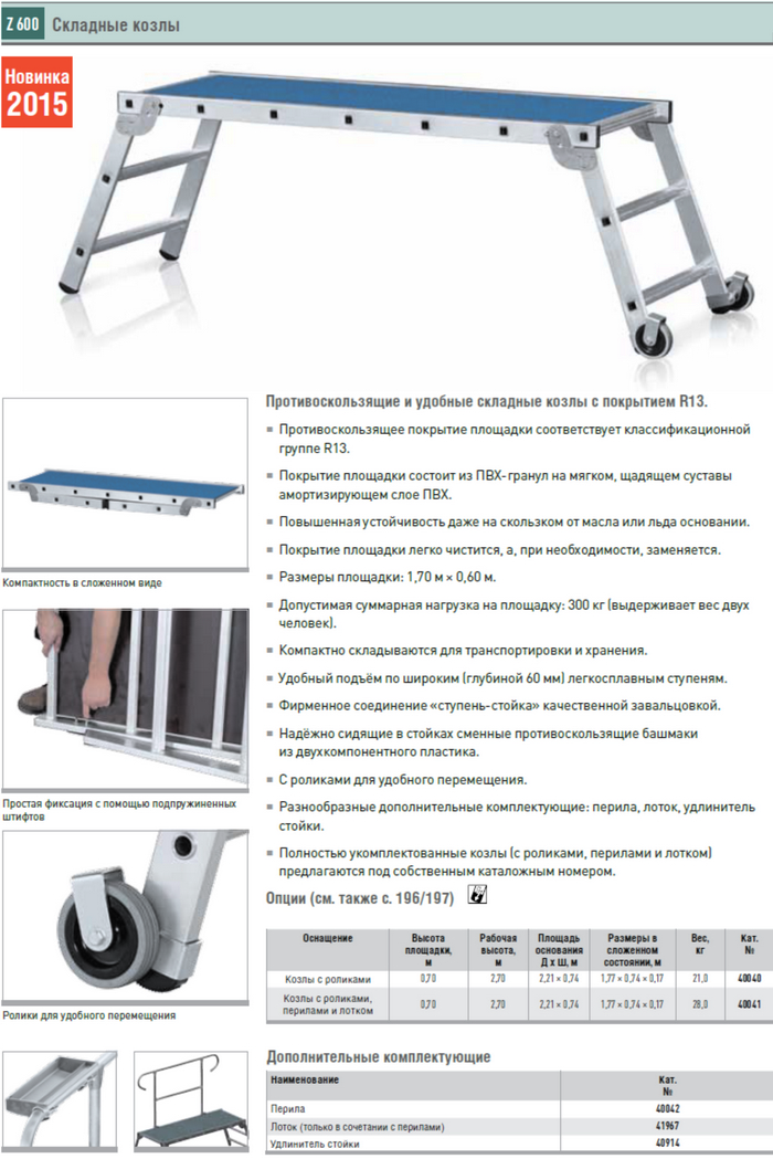 Рабочая платформа, складная (Германия) Высота площадки: 0,70 м. Размер пощадки Д x Ш (м): 2,21 x 0,74 Особая устойчивость против скольжения и удобство: складная рабочая платформа с настилом R13. Исключительно нескользящий настил платформы по данным оценочной группы R13. Настил платформы изготовлен из особо н… Читать дальшеескользящего ПВХ-гранулятора с несущим слоем из мягкого ПВХ и амортизацией для защиты шарниров. Повышенная безопасность даже при наличии маслянистых веществ и даже льда при эксплуатации вне помещения. Настил платформы удобен в чистке, при необходимости его можно заменить. Размеры платформы 1,70 м x 0,60 м. Общая разрешенная несущая способность площадки равна 300 кг - поэтому на ней могут работать два человека. Особо компактно складывается для транспортировки и хранения. Удобство подъема по легкосплавным ступенькам глубиной 60 мм. Фирменное соединение „перекладина-стойка“ качественной завальцовкой. Надежно сидящие в стойках сменные противоскользящие башмаки из двухкомпонентного пластика. С роликом для удобства перемещения платформы. Широкий ассортимент принадлежностей: ограждение, лоток для предметов, удлинители тетив лестницы. Наше качество – Ваша безопасность Полный каталог продукции Царгес на: http://zarges-all.ru/order Россия, 620042, Екатеринбург, ул. Ломоносова, д. 55Б, офис 14, тел./факс: (343) 382-69-10, 381-59-97 www.kaiman.ru, www.zarges-all.ru, www.zarges.com/ru - сайт производителя. E-mail: ural@kaiman.ru